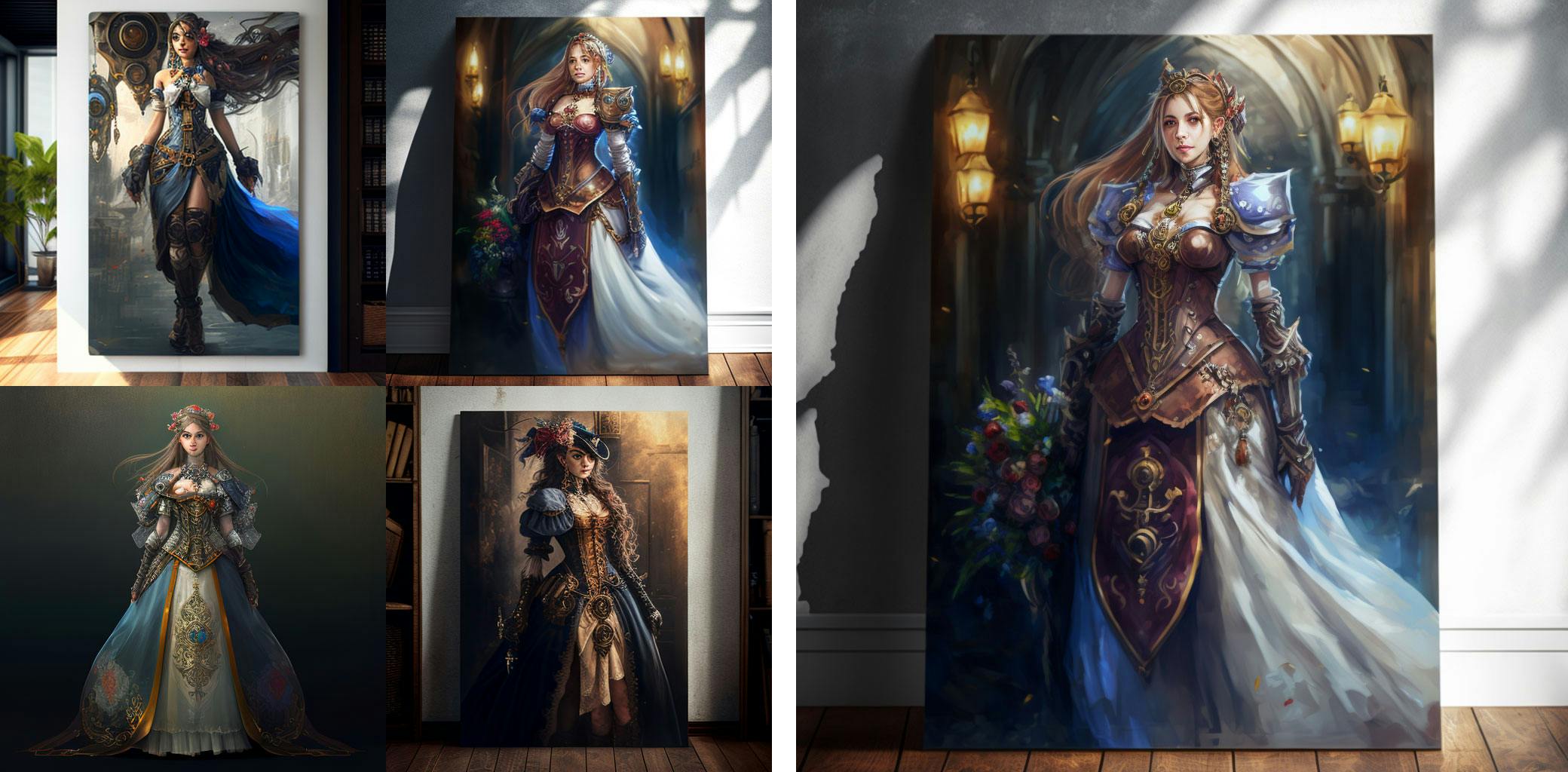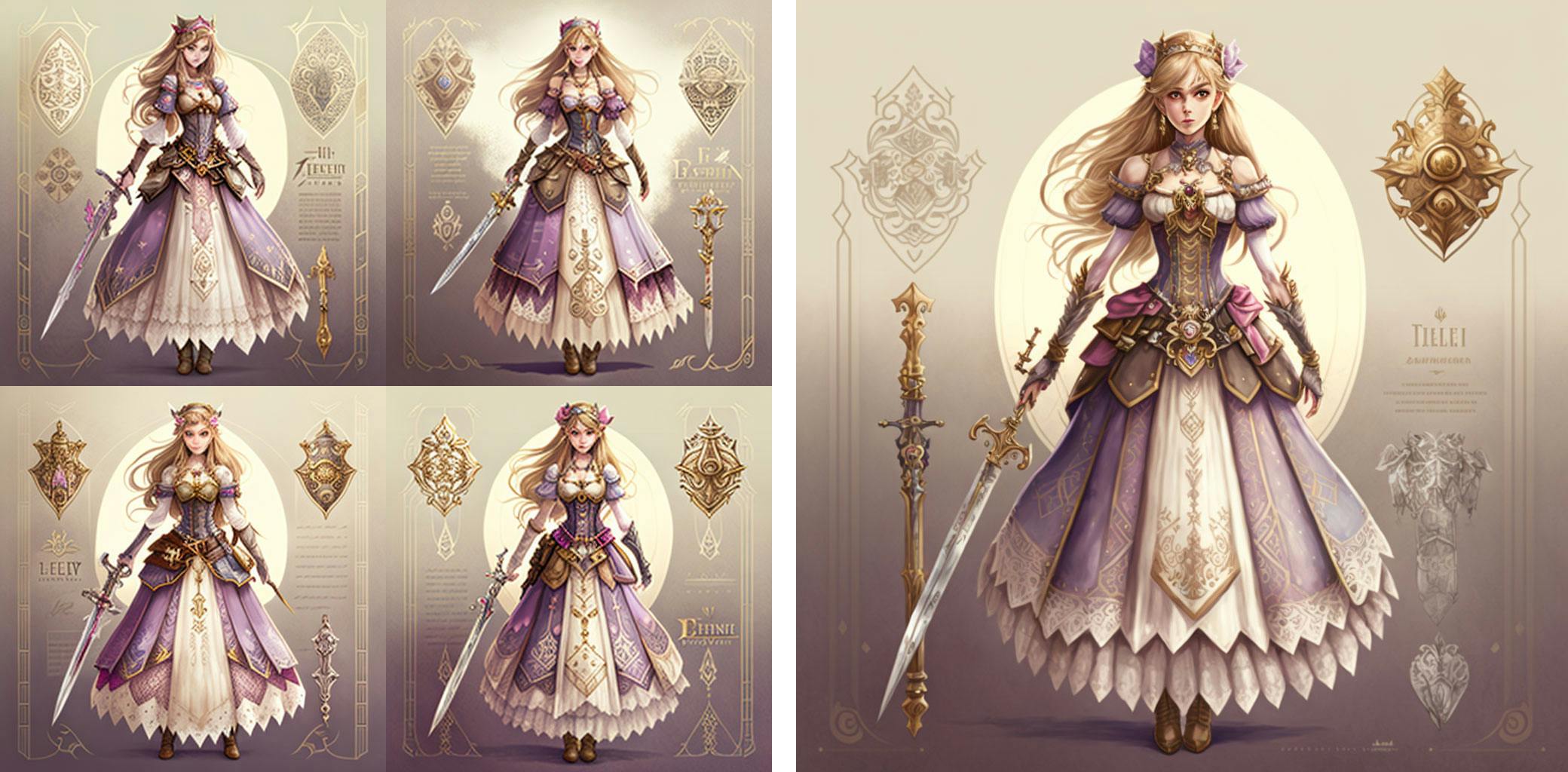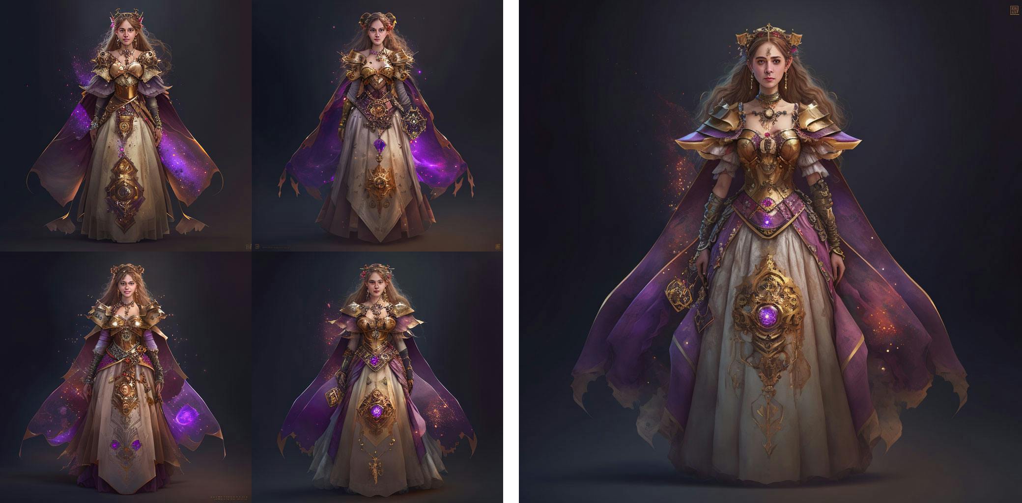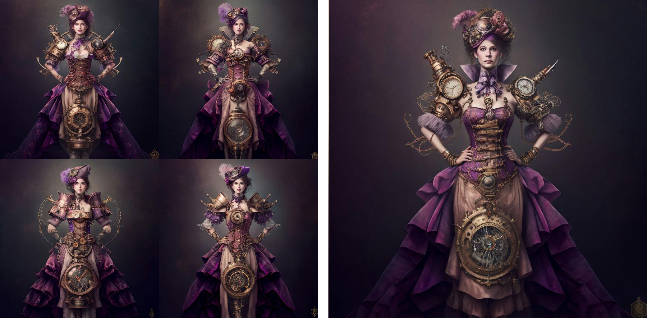 For this experiment, I wanted to use Midjourney AI to generate costume inspirations for a steampunk Princess Zelda. The process was simple: I entered a few keywords related to the theme, and the AI generated four ideas. I could then either upscale one, use one as a prompt to get four more images, have regenerate the images using the same prompt, or ask for a new prompt all together. I started out simple and direct, and what the AI produced was also pretty direct (though I wouldn't call the design simple):