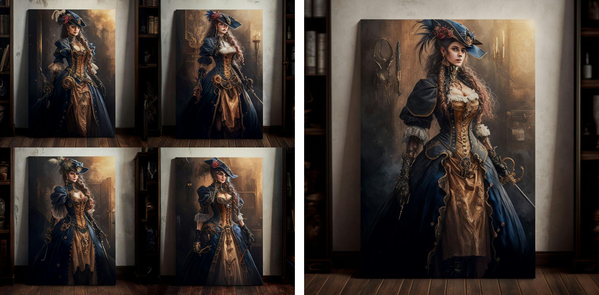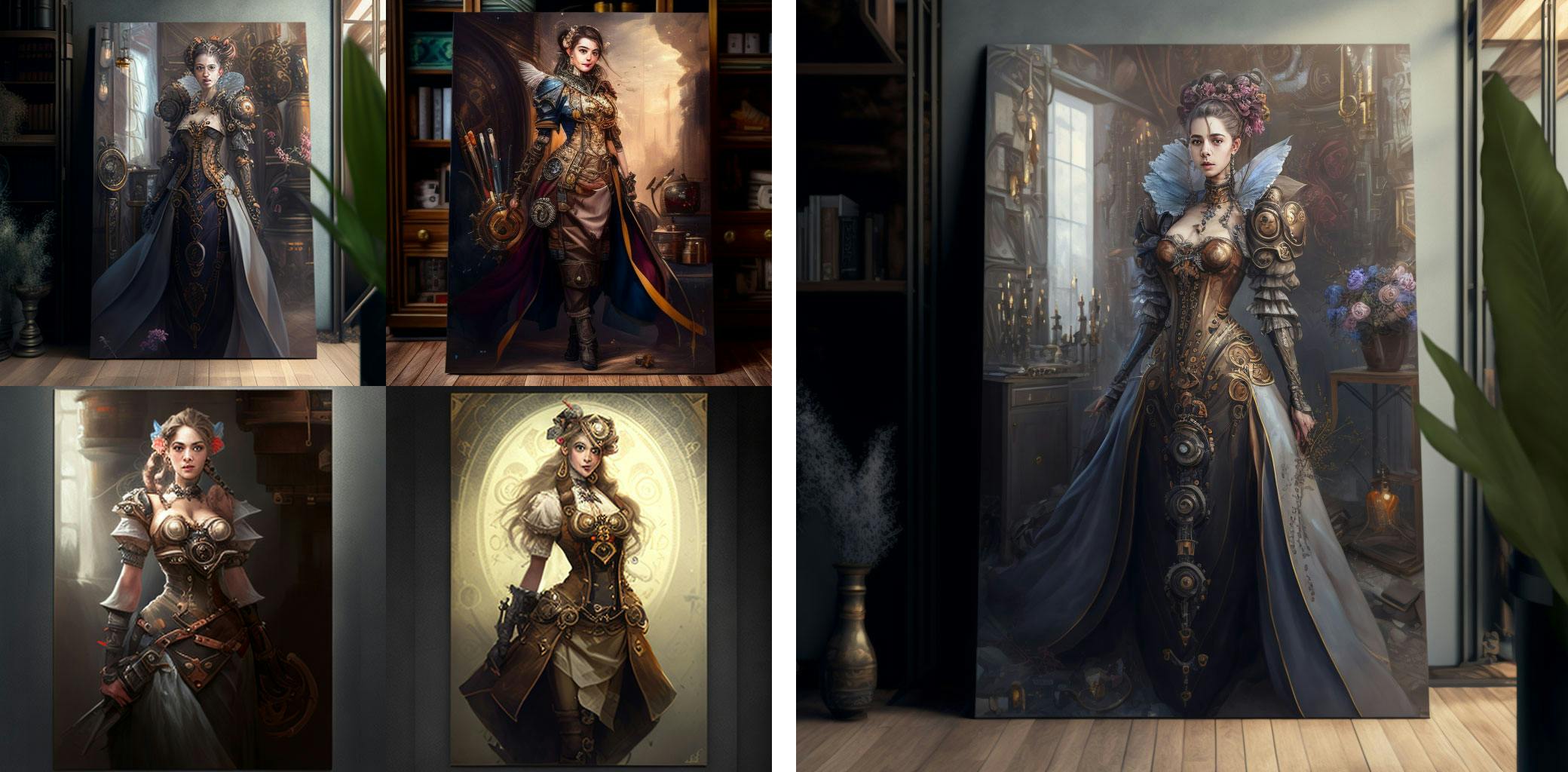 All of these images were very different and could be used to make very different cosplays. Do I want something that looks like a Medieval knight? Or a Victorian lady? Or steamship captain? Or something more traditionally steampunk? I then started looking at some of favorite images in more details and trying to understand how I could bring one of these to life. And this is where I understood exactly why AI won't be replacing real artists anytime soon.