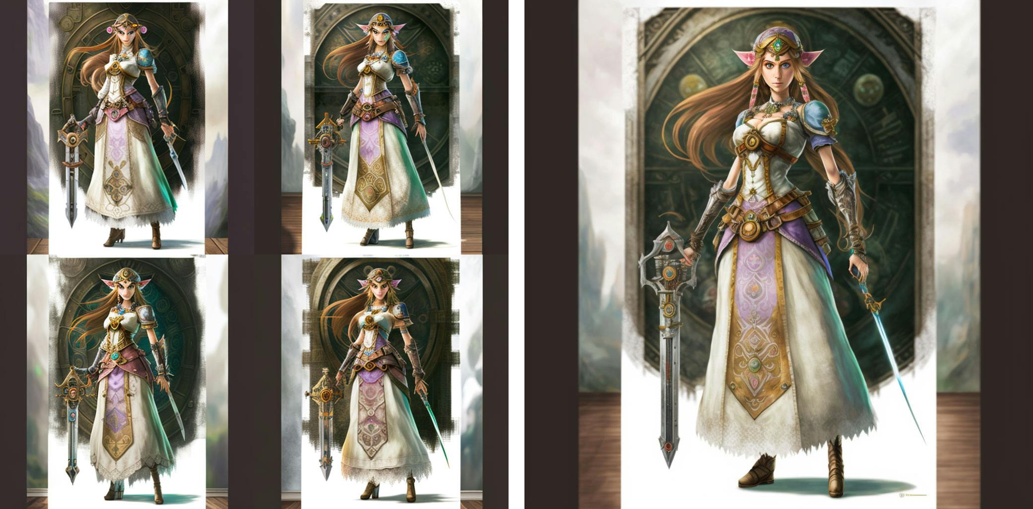 I noticed that since I wasn't specific about Princess Zelda from Twilight Princess, it was sometimes generating an image with lots of blue and gold: very Breath of the Wild inspired. Midjourney AI allows you to use an external image as a prompt, so I was curious what would happen if I fed it one of the original concept arts from the game:
