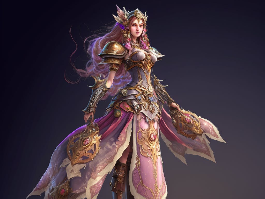 Prompt: a full body image of a steampunk princess zelda princess dress, holding a sword gold, pink, purple, and white in color, full-length,“Full-length portrait”, “Wide field of view”, neutral background, 8k, hd
