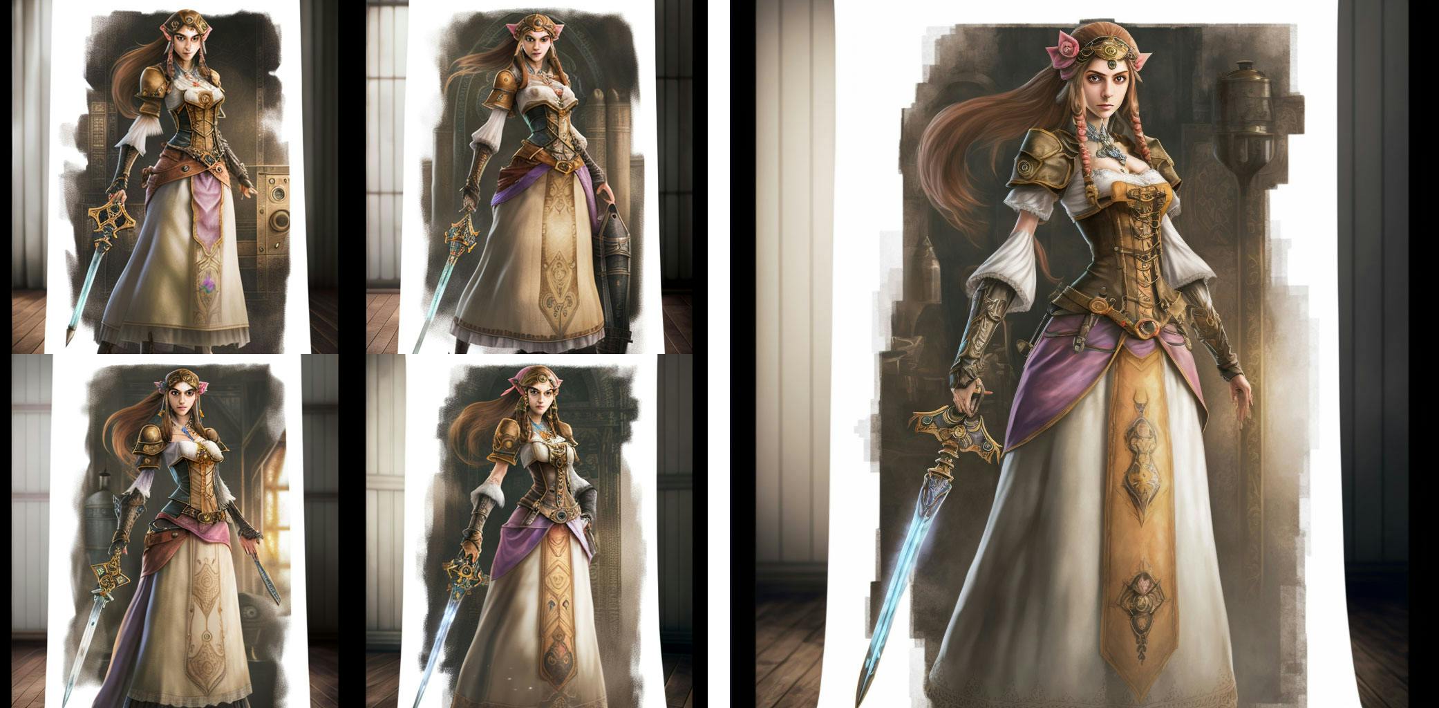Prompt: [image] + steampunk zelda painting ultra quality, 8k, hd full-length